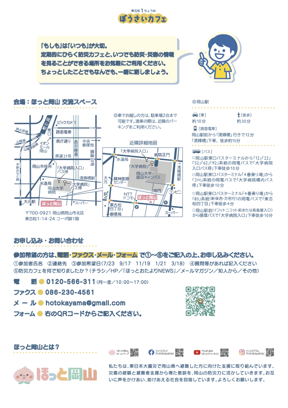 ①参加者氏名 ②連絡先 ③参加希望日(7/23 9/17 11/19 1/21 3/18) ④質問等があれば記入ください ⑤防災カフェを何で知りましたか?(チラシ/HP/「ほっとおたよりNEWS」/メールマガジン/Instagram/Facebook/知人から/その他)