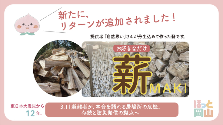 岡山の応援者さん「自然思い」さんから、「岡山産の薪」があらたなリターン品としてご提供いただくことになりました!愛情たっぷり! 十分に乾燥した薪(楢の木)です。