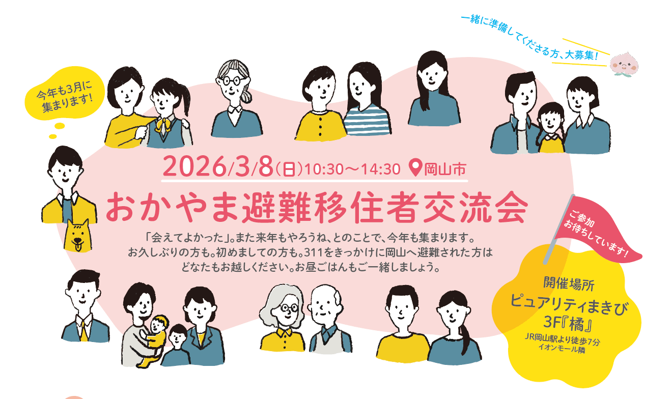 2026年3月8日(日)に岡山県危機管理課との共催で毎年恒例となる「おかやま避難者交流会」を開催します。